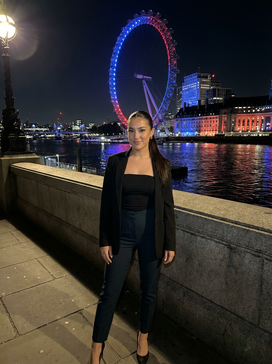 model on South Bank, London Eye and Thames, evening city lights, sophisticated outfit