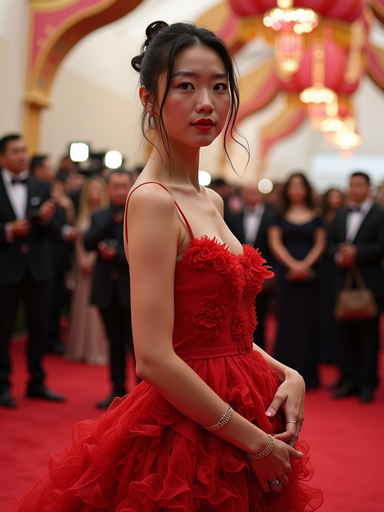 model on the Met Gala red carpet at the Metropolitan Museum of Art, wearing an avant-garde couture gown with dramatic silhouette , camera flashes and celebrity attendees in background, elaborate Met Gala decorations visible