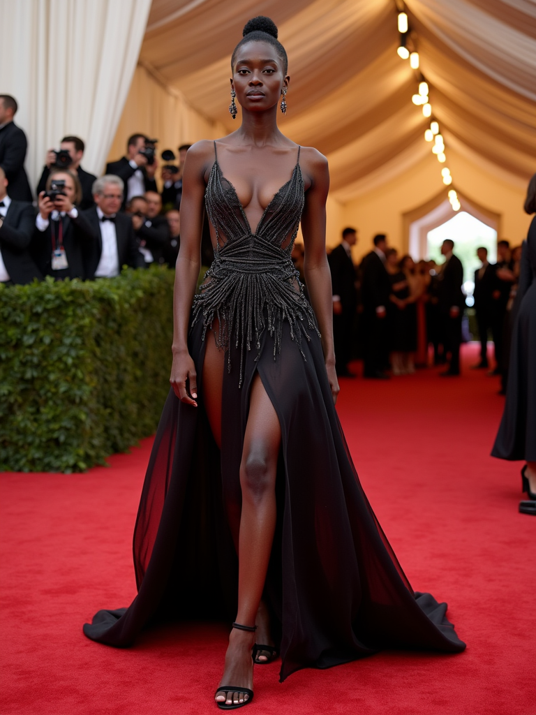 model on the Met Gala red carpet at the Metropolitan Museum of Art, wearing an avant-garde couture gown with dramatic silhouette , camera flashes and celebrity attendees in background, elaborate Met Gala decorations visible