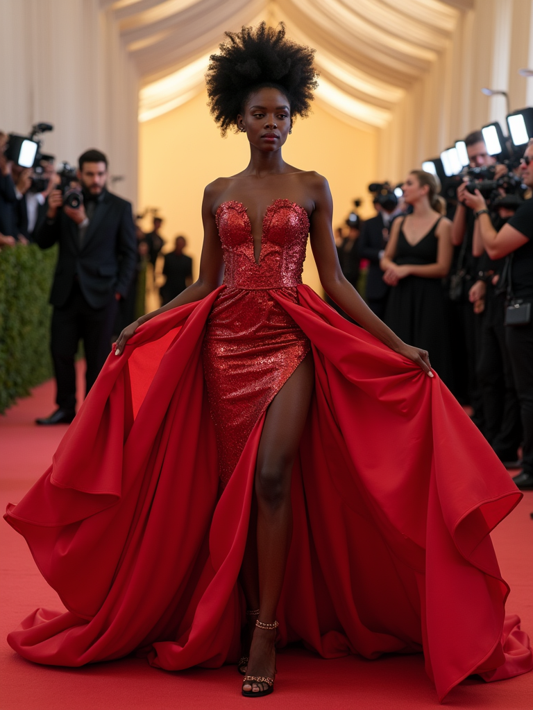 model on the Met Gala red carpet at the Metropolitan Museum of Art, wearing an avant-garde couture gown with dramatic silhouette , camera flashes and celebrity attendees in background, elaborate Met Gala decorations visible