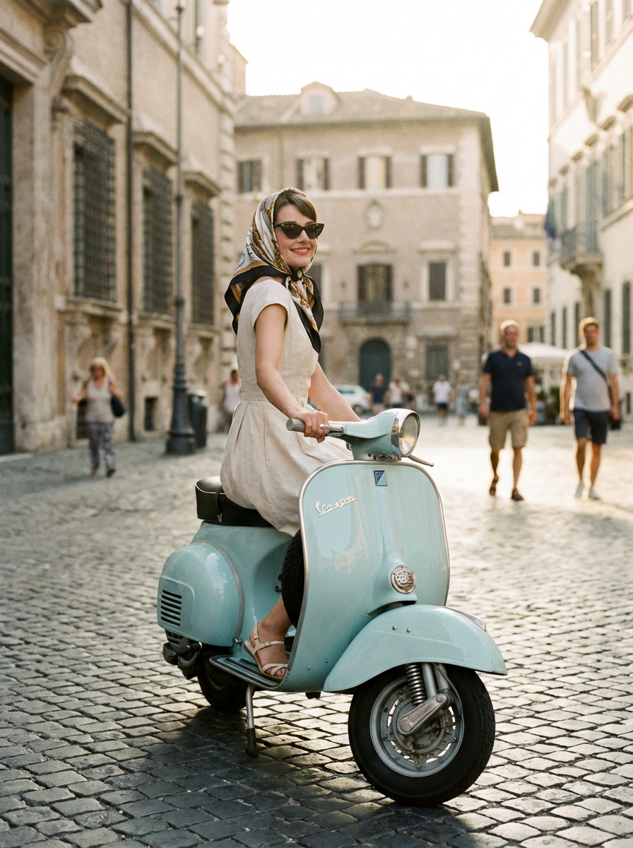 model on Vespa scooter, Roman Holiday aesthetic, headscarf and sunglasses , iconic scene