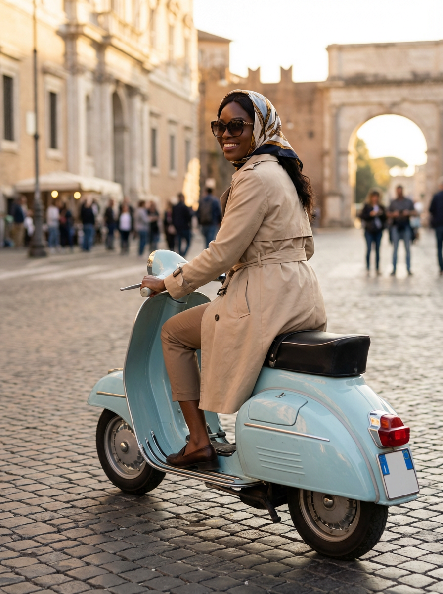 model on Vespa scooter, Roman Holiday aesthetic, headscarf and sunglasses , iconic scene