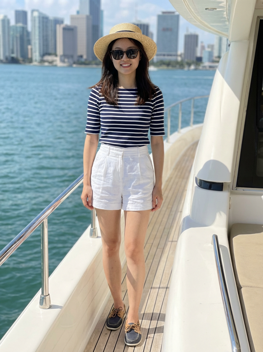 model on yacht in Miami, Biscayne Bay, luxury lifestyle, nautical chic outfit, sunny day