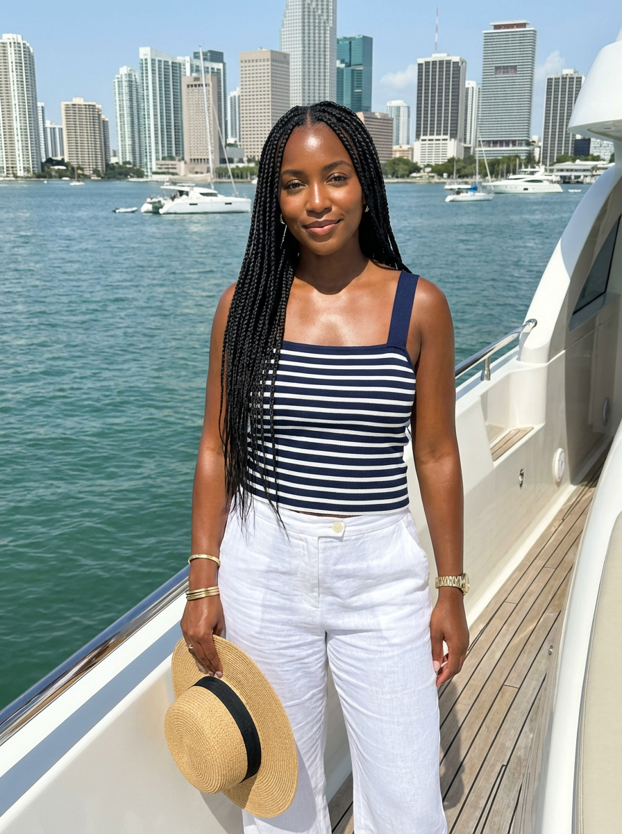 model on yacht in Miami, Biscayne Bay, luxury lifestyle, nautical chic outfit, sunny day