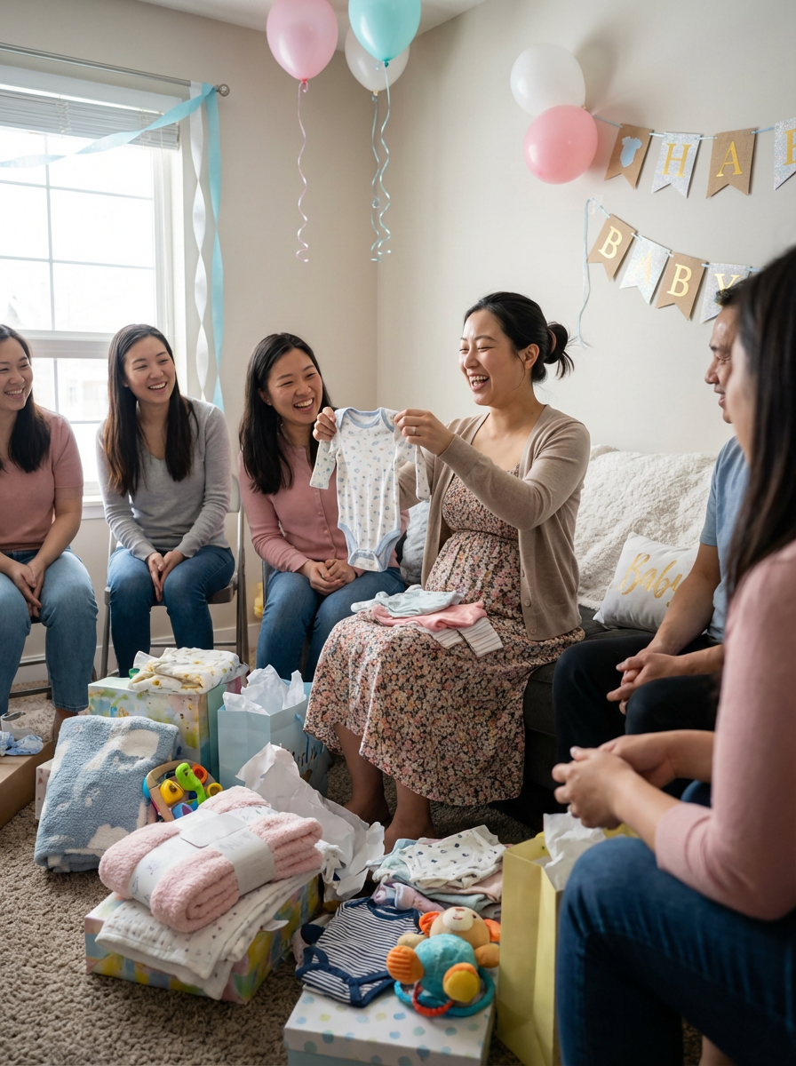 model opening baby shower gifts, cute baby items, surrounded by loved ones, joyful expression
