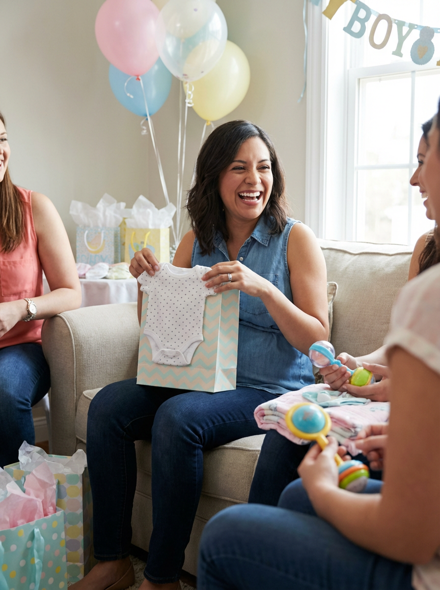 model opening baby shower gifts, cute baby items, surrounded by loved ones, joyful expression