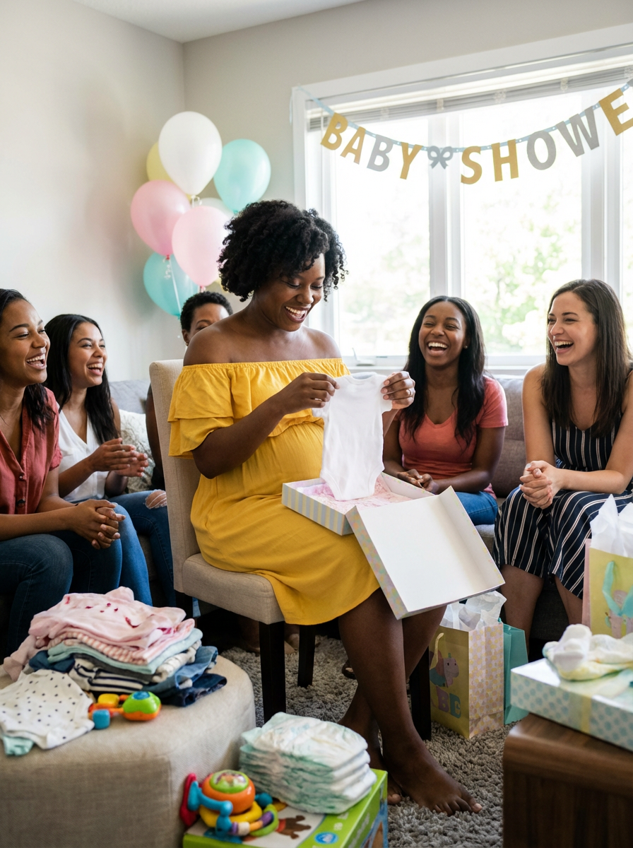 model opening baby shower gifts, cute baby items, surrounded by loved ones, joyful expression