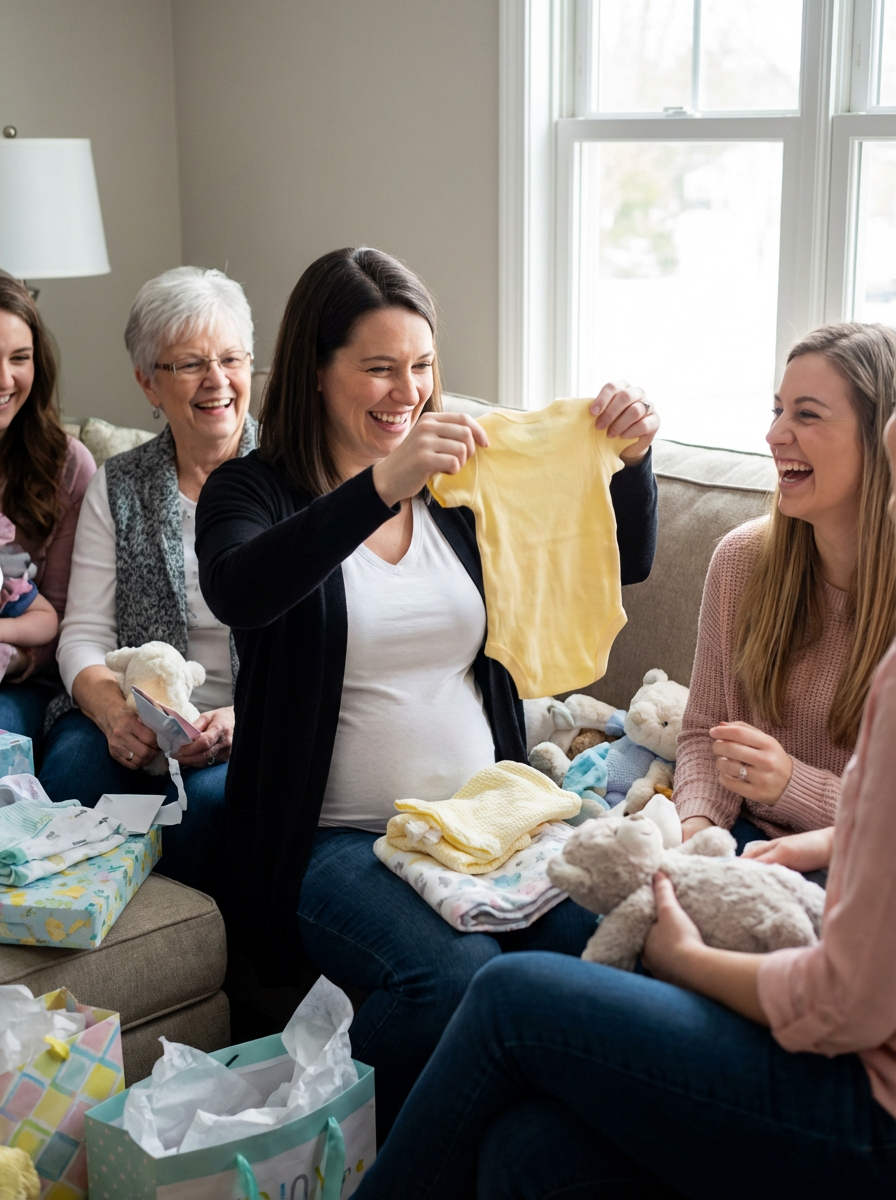 model opening baby shower gifts, cute baby items, surrounded by loved ones, joyful expression