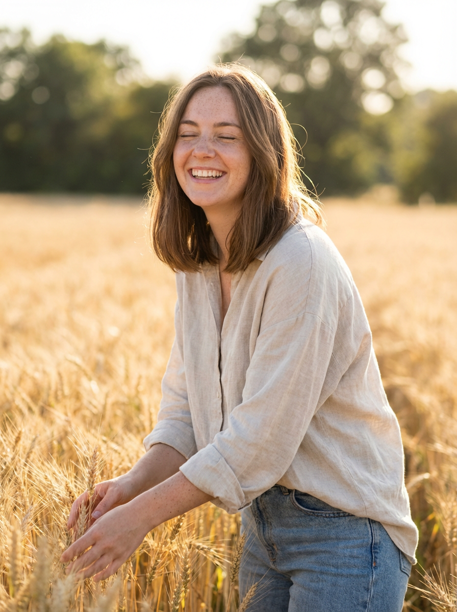 model outside in nature in forest or jungle or a field of wheat enjoying the natural world