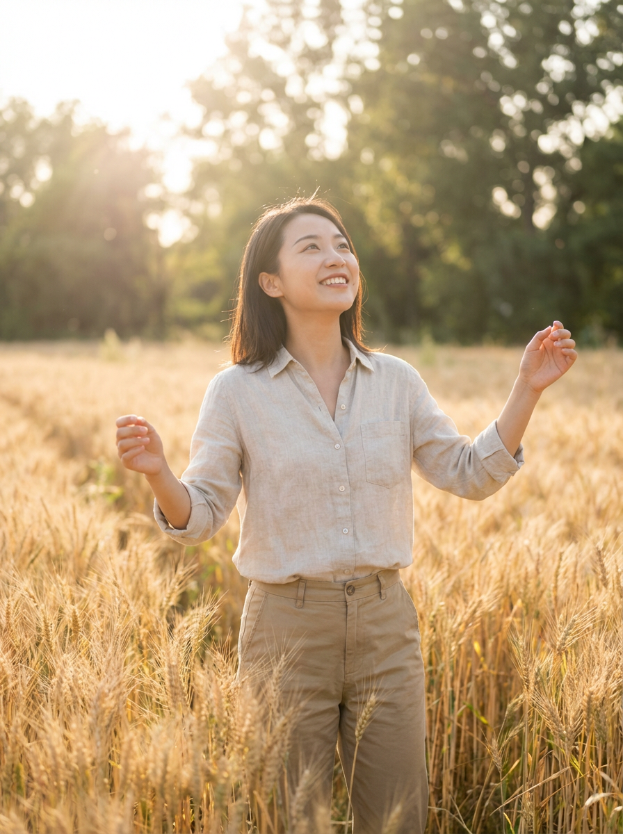 model outside in nature in forest or jungle or a field of wheat enjoying the natural world