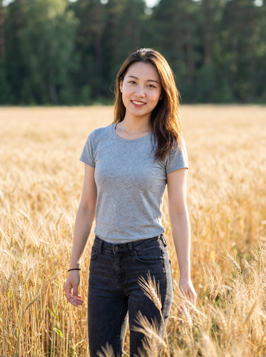 model outside in nature in forest or jungle or a field of wheat enjoying the natural world