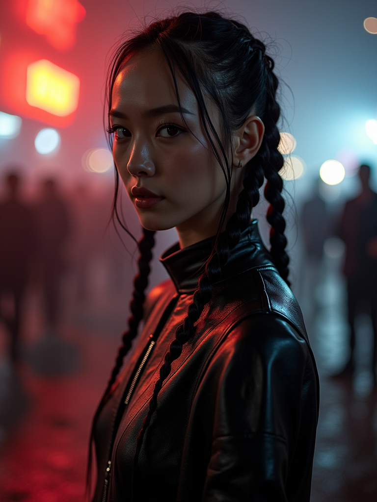 model outside techno party outside berghain night club in berlin at night. the model wears black sheer leather dress with a lot of cut outs, futuristic techno design. clean cuts. hair in futuristic braids.