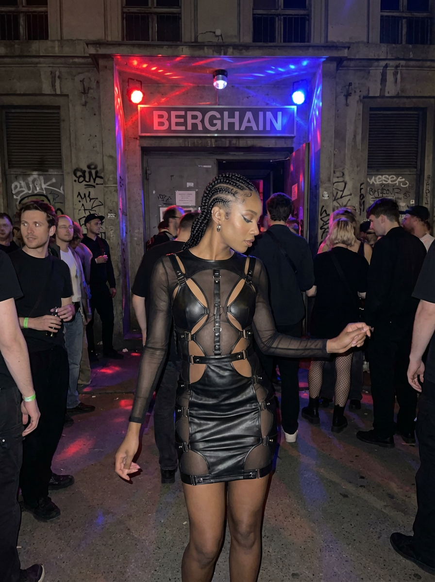 model outside techno party outside berghain night club in berlin at night. the model wears black sheer leather dress with a lot of cut outs, futuristic techno design. clean cuts. hair in futuristic braids.