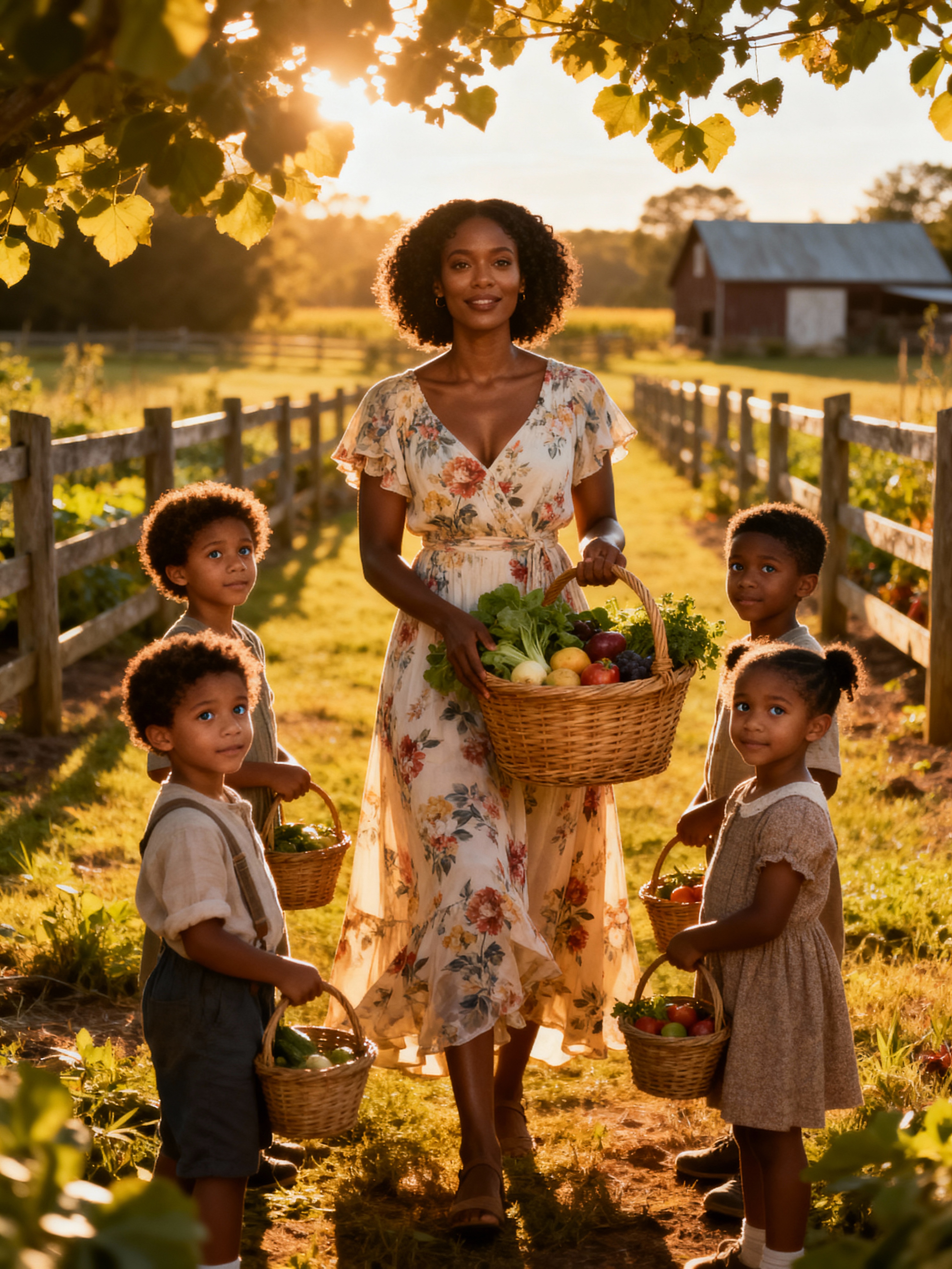 model picking fruits and vegetables on the home farm with wicker baskets alongside her four children carrying small baskets, wearing a long, flowing dress with floral patterns, carrying fresh produce