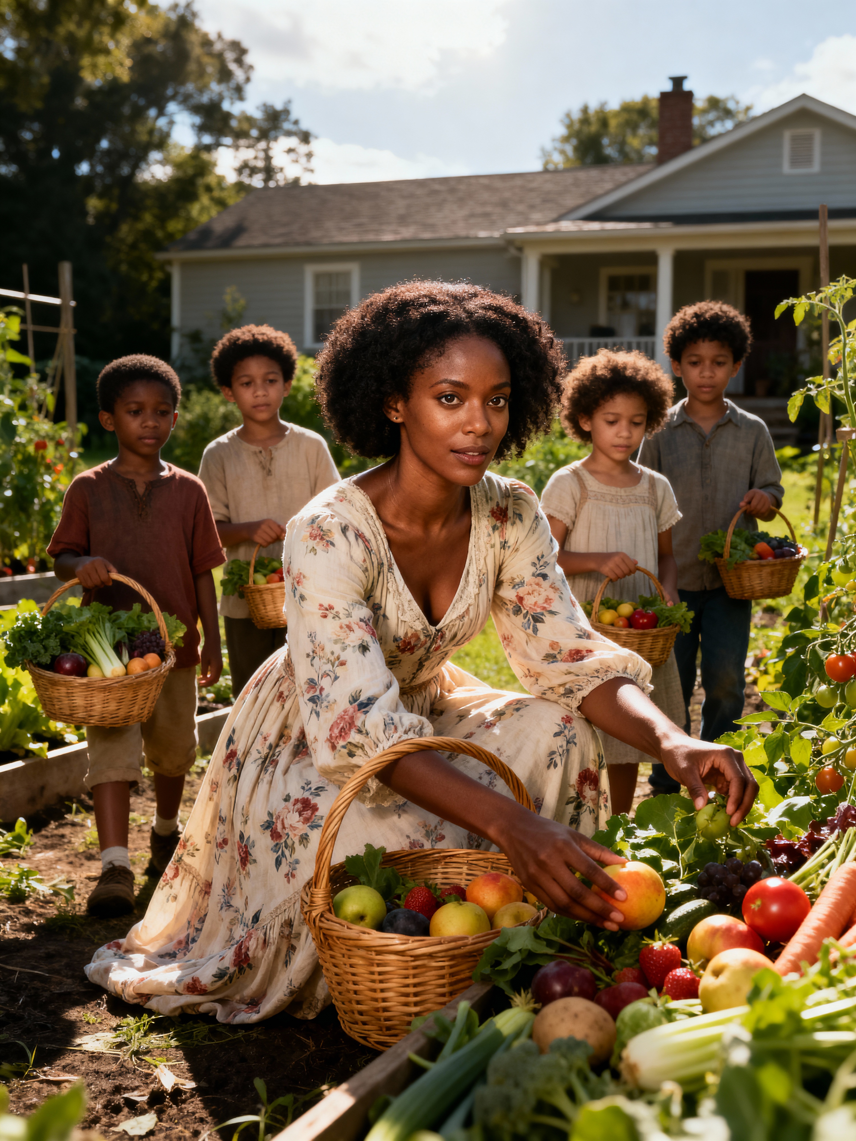 model picking fruits and vegetables on the home farm with wicker baskets alongside her four children carrying small baskets, wearing a long, flowing dress with floral patterns, carrying fresh produce