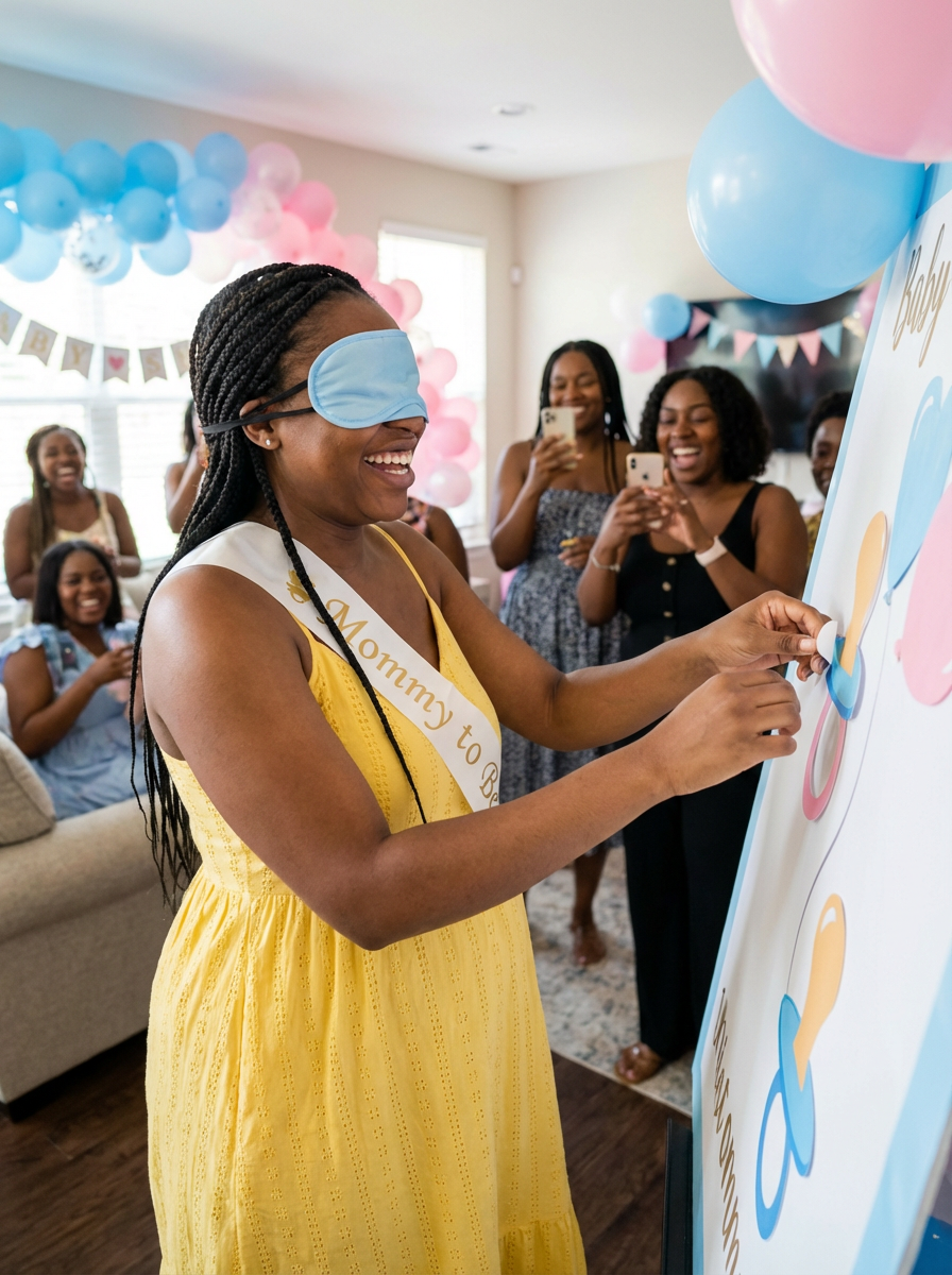 model playing baby shower games, fun party activities, guests laughing, festive atmosphere