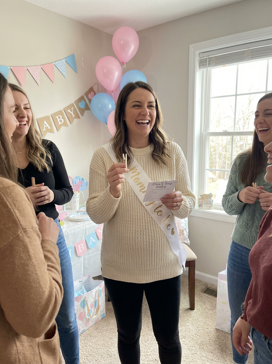 model playing baby shower games, fun party activities, guests laughing, festive atmosphere