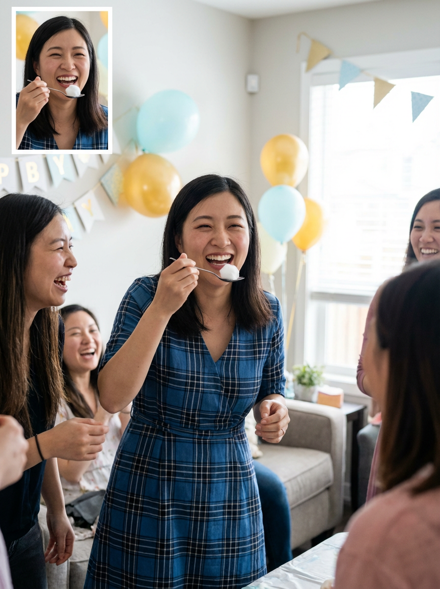 model playing baby shower games, fun party activities, guests laughing, festive atmosphere