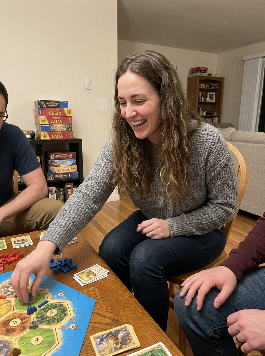 model playing board games or at game night, fun personality showing, casual comfortable setting