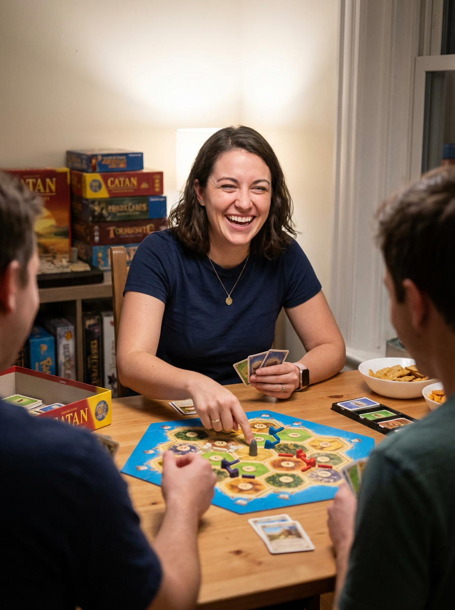 model playing board games or at game night, fun personality showing, casual comfortable setting