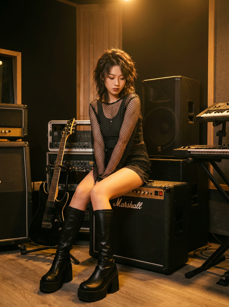 model posing in a music studio surrounded by various speakers, a guitar, and a keyboard. She is sitting on a Marshall amplifier and is dressed in a revealing outfit consisting of fishnet attire and knee-high platform boots. Model look is complemented by their styled hair and a contemplative expression on her face. The lighting in the room highlights them and casts a glow that enhances the ambience of the studio setting. the photo emphasizes their perfect body shapes.