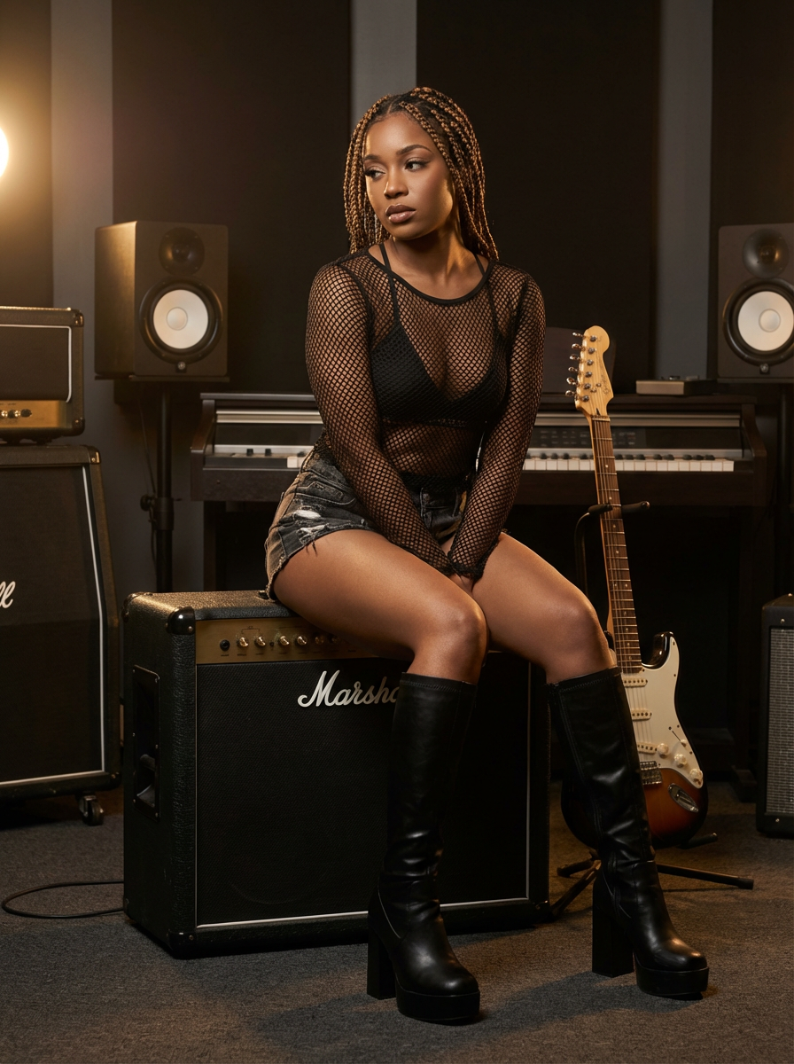 model posing in a music studio surrounded by various speakers, a guitar, and a keyboard. She is sitting on a Marshall amplifier and is dressed in a revealing outfit consisting of fishnet attire and knee-high platform boots. Model look is complemented by their styled hair and a contemplative expression on her face. The lighting in the room highlights them and casts a glow that enhances the ambience of the studio setting. the photo emphasizes their perfect body shapes.