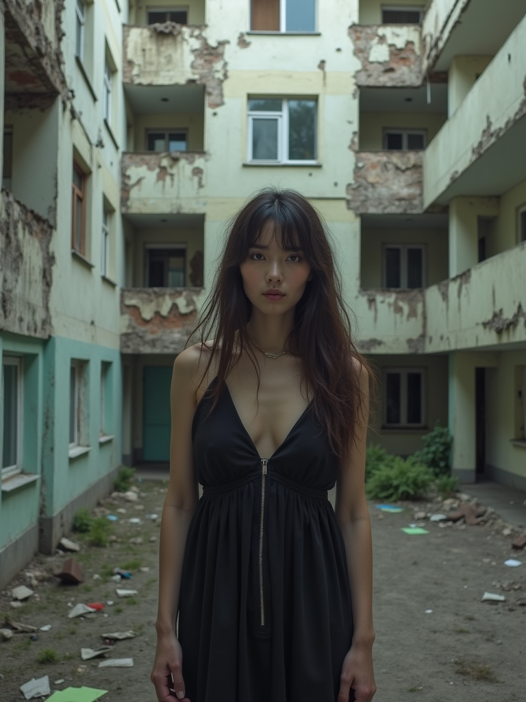 model posing in front of abandoned derelict Soviet era Russian block of 1950s flats. crumbling walls, fallen off tiles. in terrible condition. haunted atmosphere.