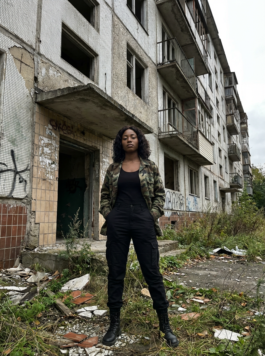 model posing in front of abandoned derelict Soviet era Russian block of 1950s flats. crumbling walls, fallen off tiles. in terrible condition. haunted atmosphere.