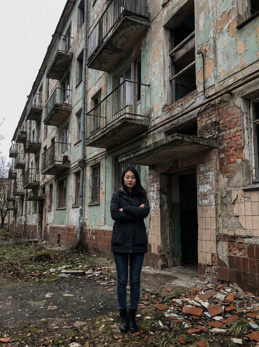 model posing in front of abandoned derelict Soviet era Russian block of 1950s flats. crumbling walls, fallen off tiles. in terrible condition. haunted atmosphere.