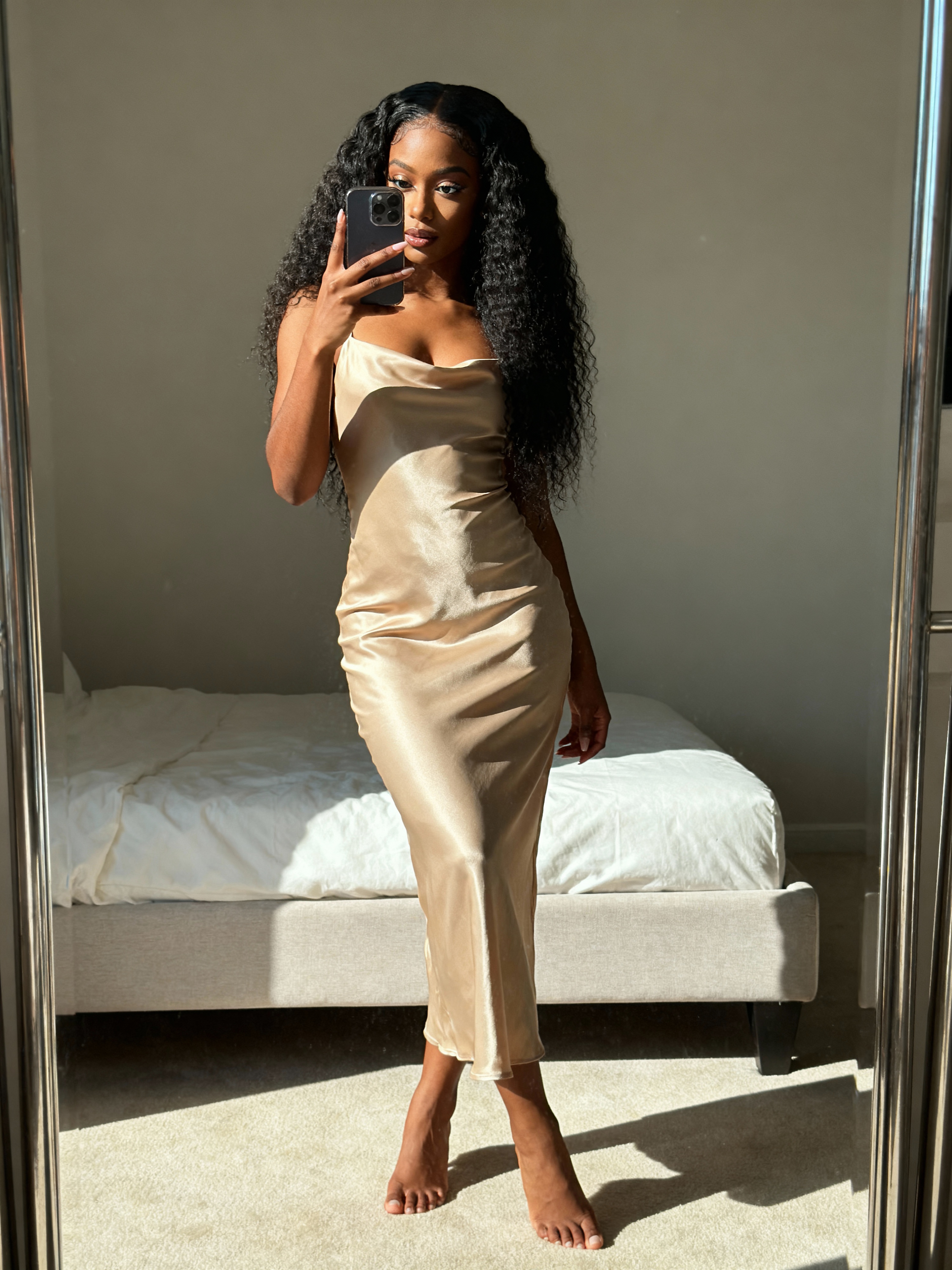 model posing in front of mirror wearing a form-fitting sand-colored silk dress . the model's left hand is visible holding a phone in front of their face, while the right arm rests by their side. the setting includes a light-colored bed and a neutral-colored wall, with natural light casting soft shadows on the floor.