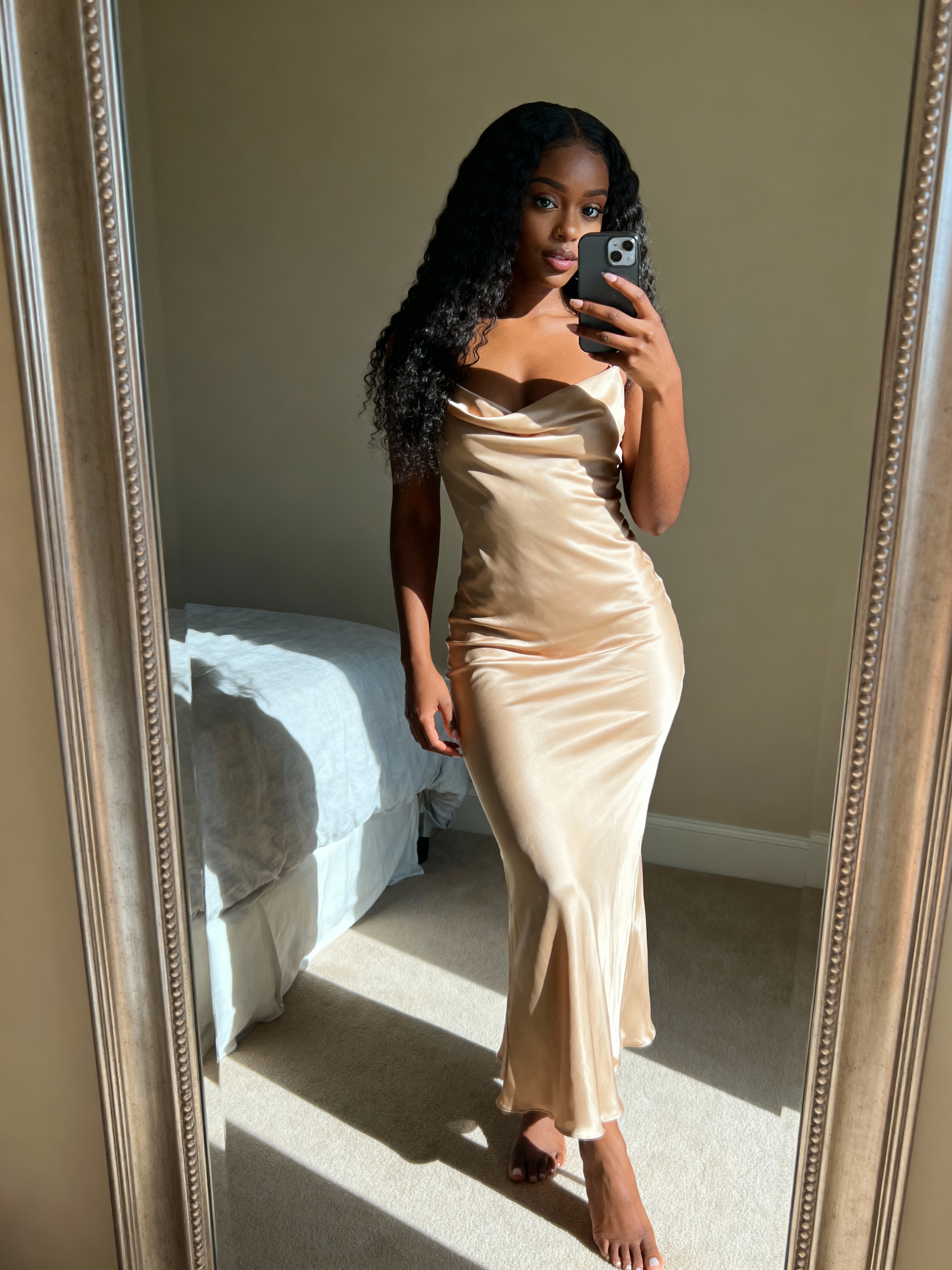 model posing in front of mirror wearing a form-fitting sand-colored silk dress . the model's left hand is visible holding a phone in front of their face, while the right arm rests by their side. the setting includes a light-colored bed and a neutral-colored wall, with natural light casting soft shadows on the floor.