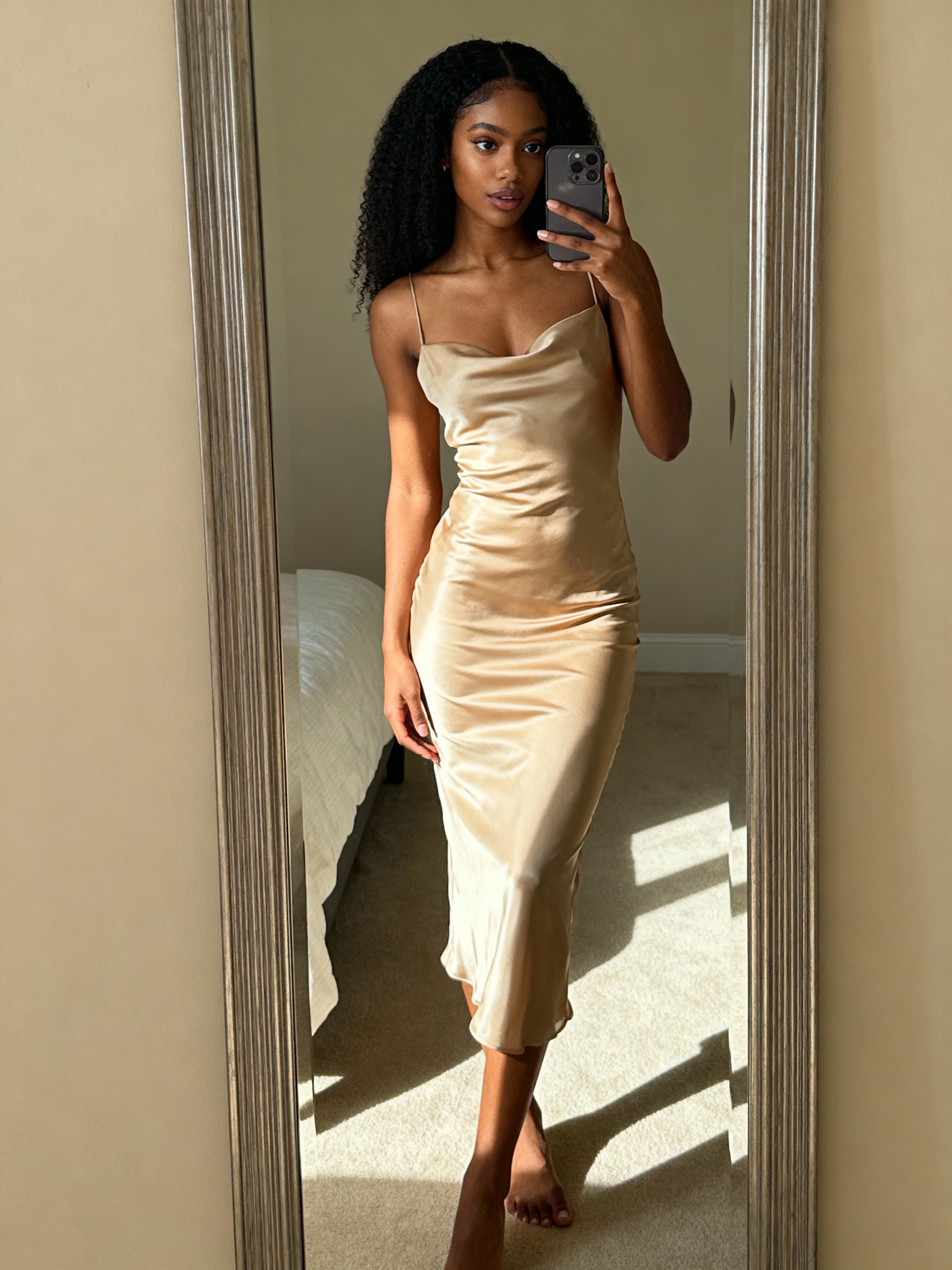 model posing in front of mirror wearing a form-fitting sand-colored silk dress . the model's left hand is visible holding a phone in front of their face, while the right arm rests by their side. the setting includes a light-colored bed and a neutral-colored wall, with natural light casting soft shadows on the floor.