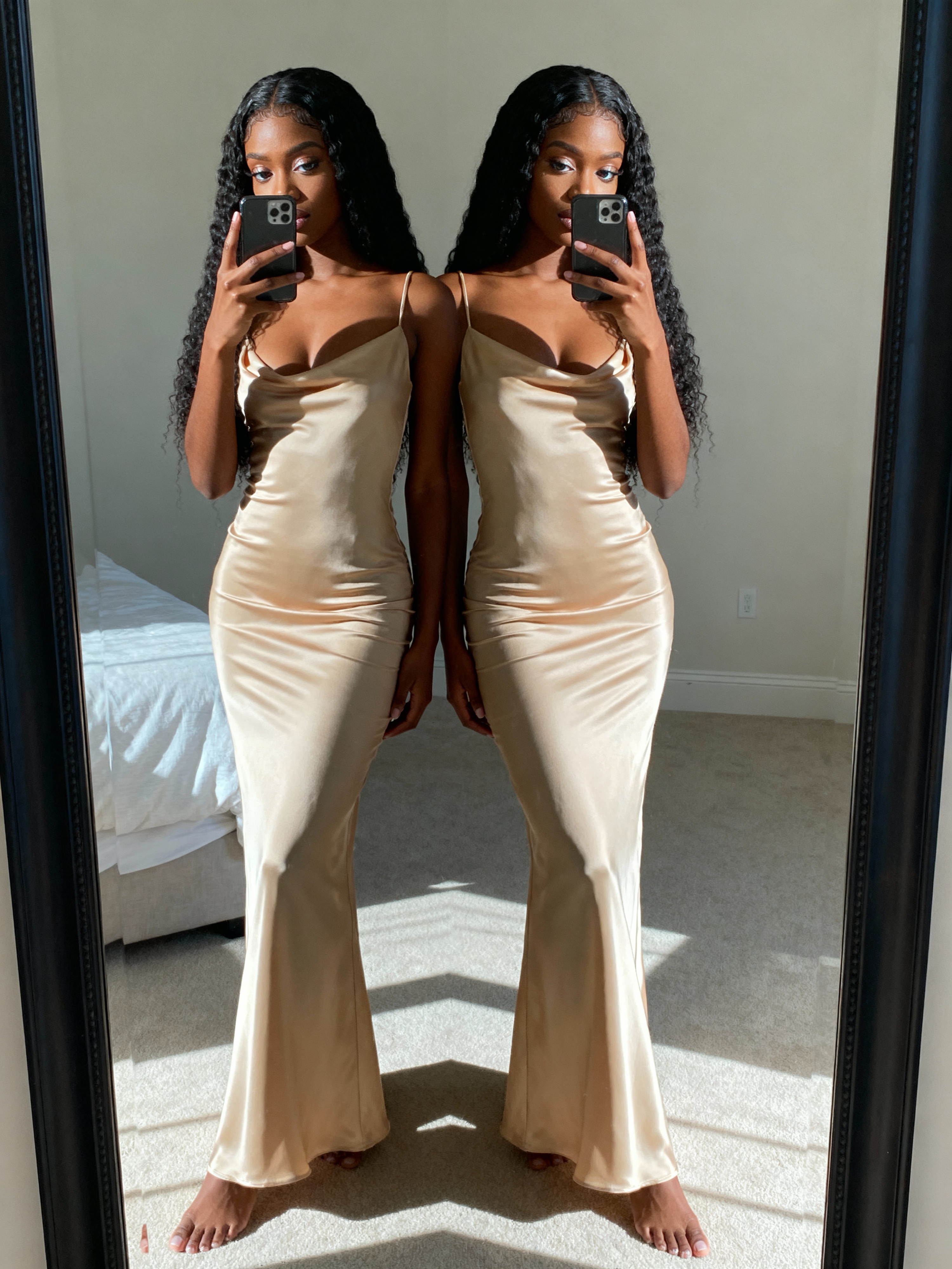 model posing in front of mirror wearing a form-fitting sand-colored silk dress . the model's left hand is visible holding a phone in front of their face, while the right arm rests by their side. the setting includes a light-colored bed and a neutral-colored wall, with natural light casting soft shadows on the floor.