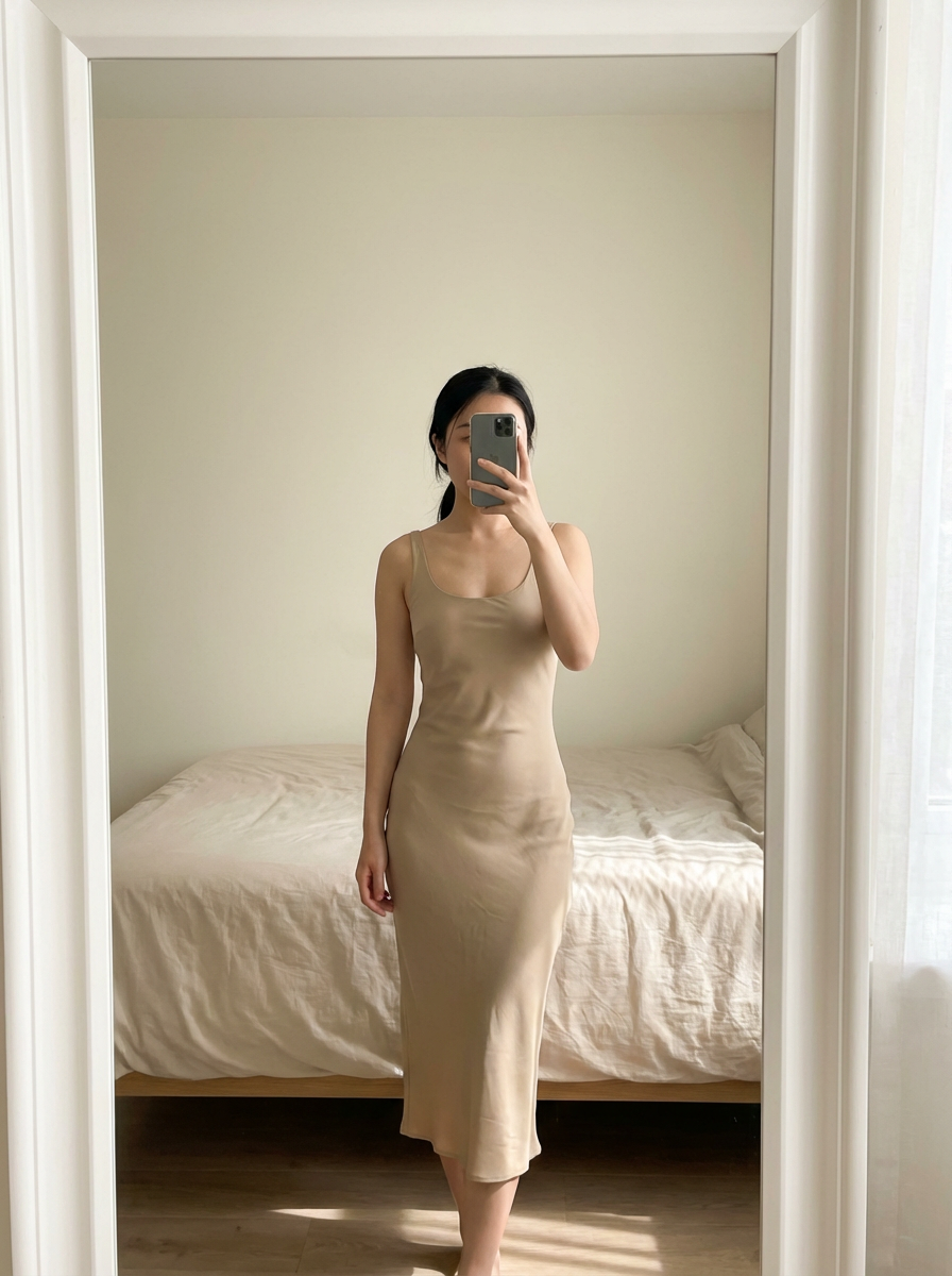 model posing in front of mirror wearing a form-fitting sand-colored silk dress . the model's left hand is visible holding a phone in front of their face, while the right arm rests by their side. the setting includes a light-colored bed and a neutral-colored wall, with natural light casting soft shadows on the floor.