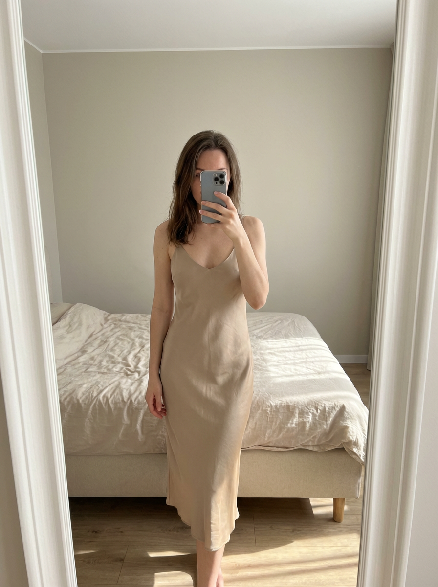 model posing in front of mirror wearing a form-fitting sand-colored silk dress . the model's left hand is visible holding a phone in front of their face, while the right arm rests by their side. the setting includes a light-colored bed and a neutral-colored wall, with natural light casting soft shadows on the floor.