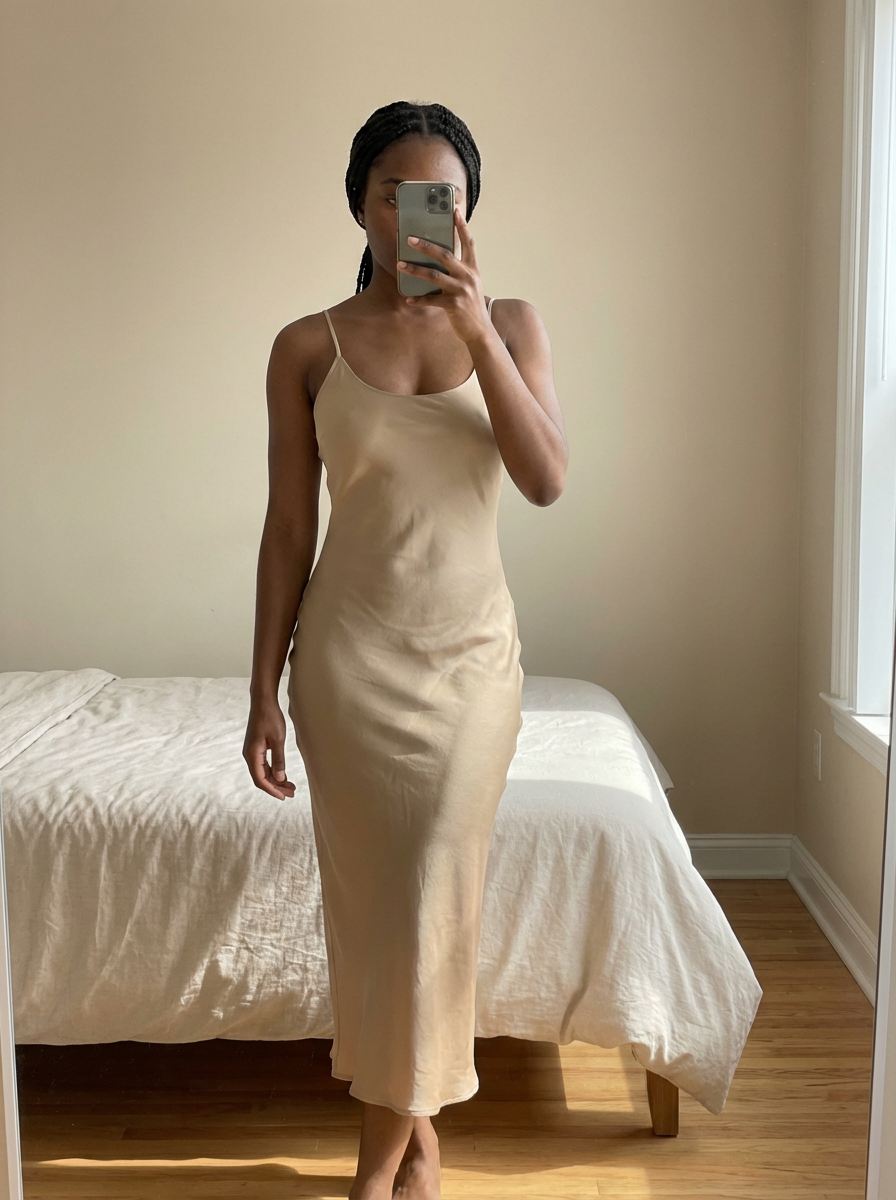 model posing in front of mirror wearing a form-fitting sand-colored silk dress . the model's left hand is visible holding a phone in front of their face, while the right arm rests by their side. the setting includes a light-colored bed and a neutral-colored wall, with natural light casting soft shadows on the floor.