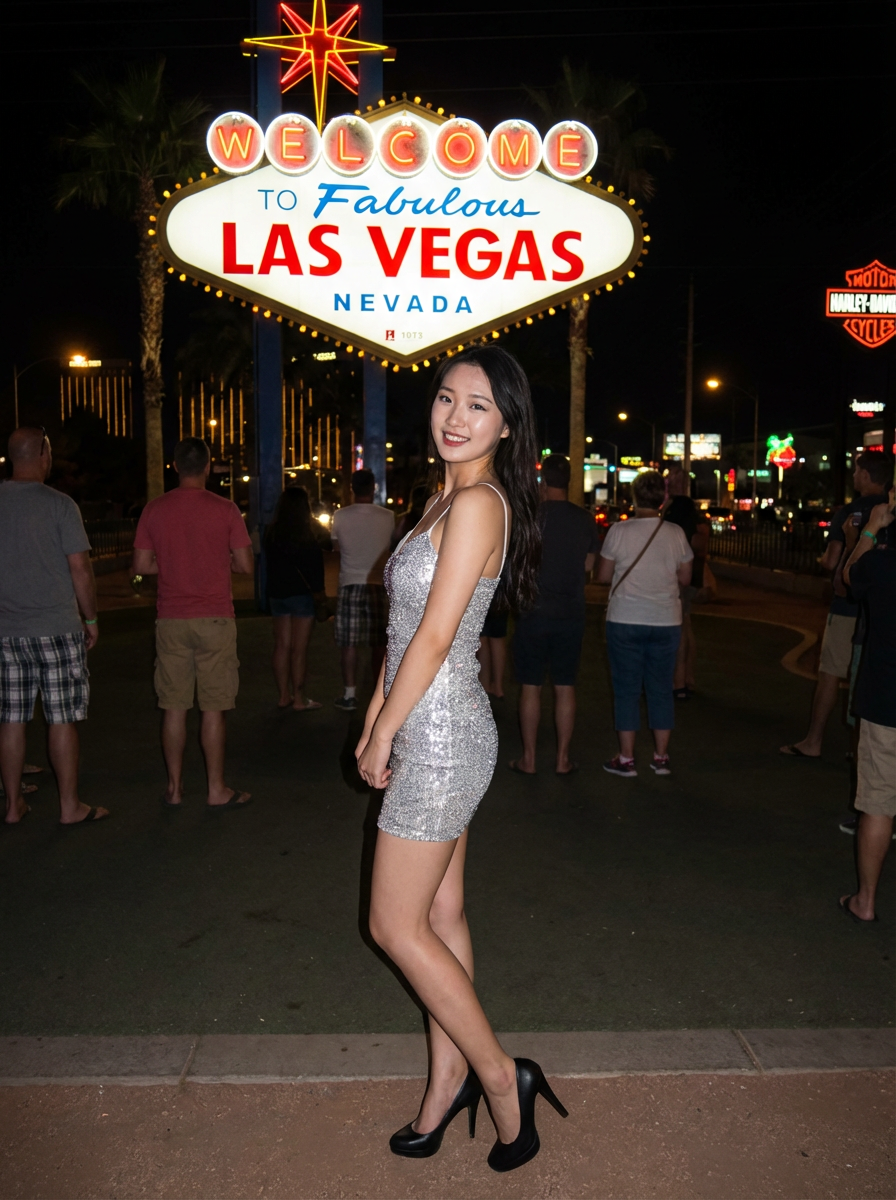 model posing in front of the famous Welcome to the Fabulous Las Vegas Nevada sign at night. camera flash. mini dress and high heels.