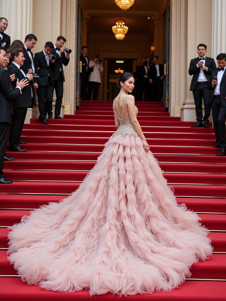 model posing on the iconic Met steps decorated for the gala, wearing a breathtaking haute couture dress with elaborate train , surrounded by photographers and fashion elite, Met Gala signage and red carpet visible