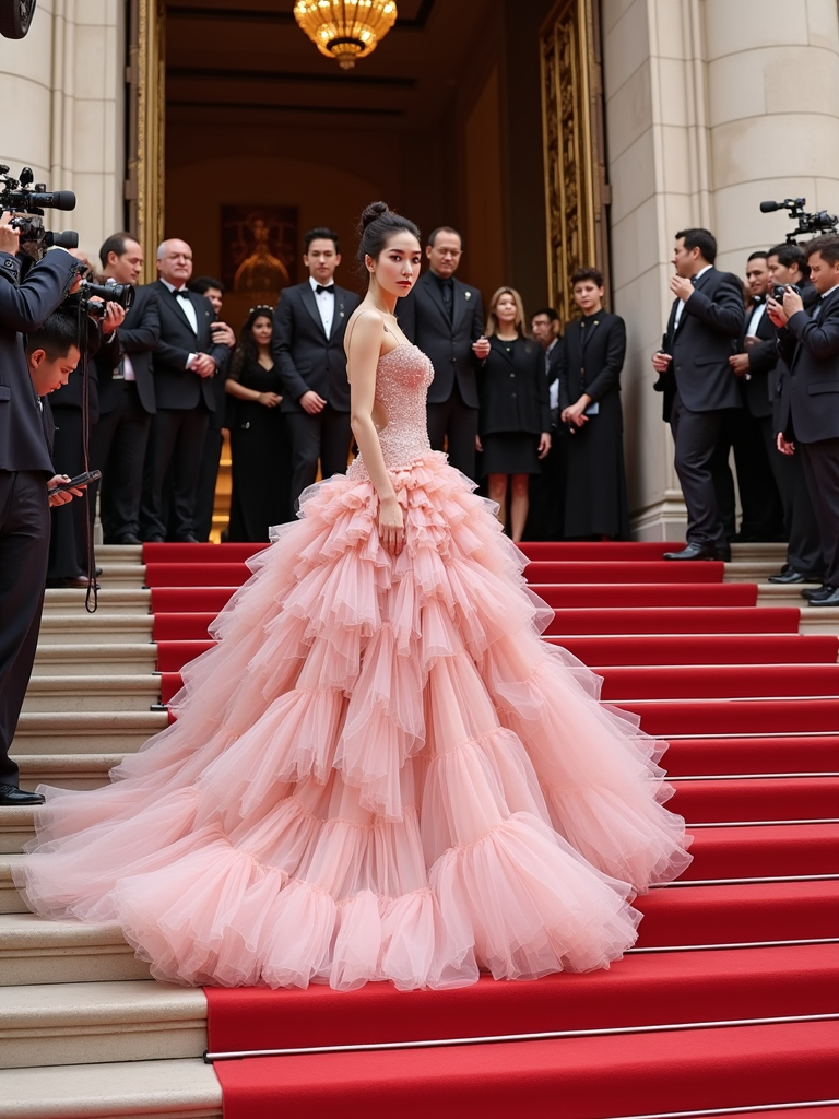 model posing on the iconic Met steps decorated for the gala, wearing a breathtaking haute couture dress with elaborate train , surrounded by photographers and fashion elite, Met Gala signage and red carpet visible