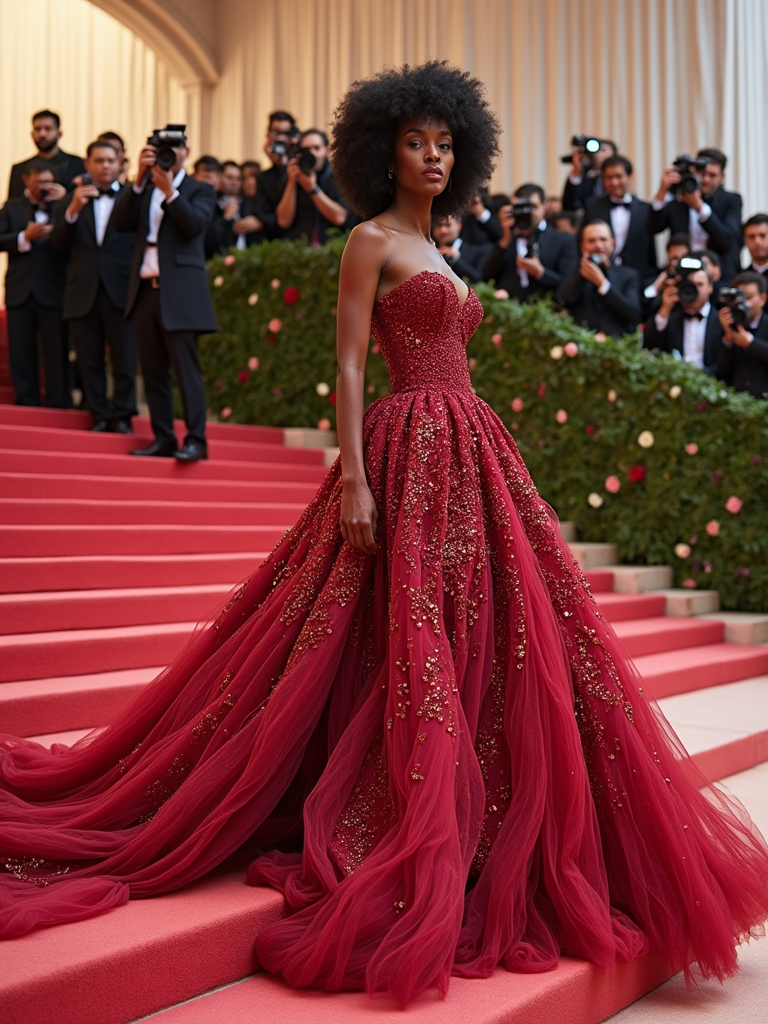model posing on the iconic Met steps decorated for the gala, wearing a breathtaking haute couture dress with elaborate train , surrounded by photographers and fashion elite, Met Gala signage and red carpet visible
