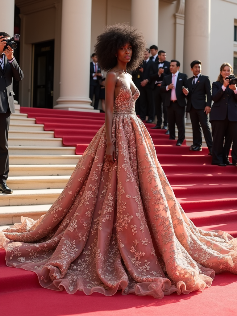 model posing on the iconic Met steps decorated for the gala, wearing a breathtaking haute couture dress with elaborate train , surrounded by photographers and fashion elite, Met Gala signage and red carpet visible