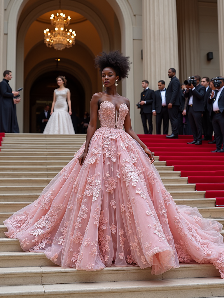 model posing on the iconic Met steps decorated for the gala, wearing a breathtaking haute couture dress with elaborate train , surrounded by photographers and fashion elite, Met Gala signage and red carpet visible