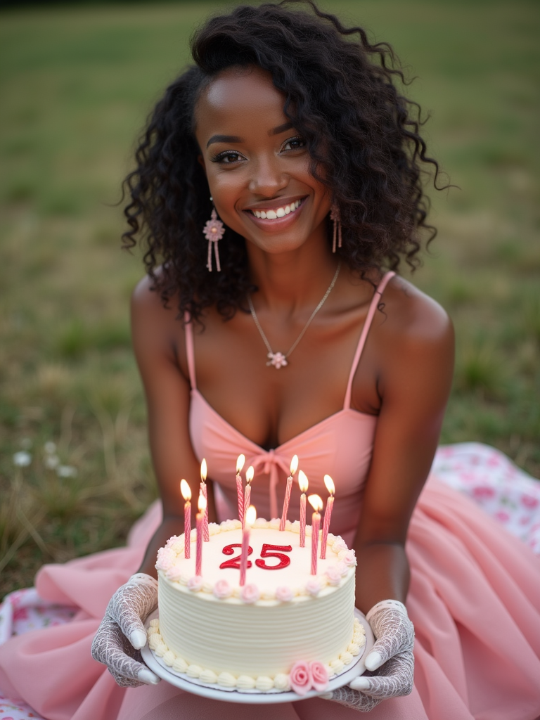 model posing with a birthday cake with candles, wearing a vintage-style pink birthday dress and lace gloves , festive picnic scene with ribbons and cake close-up