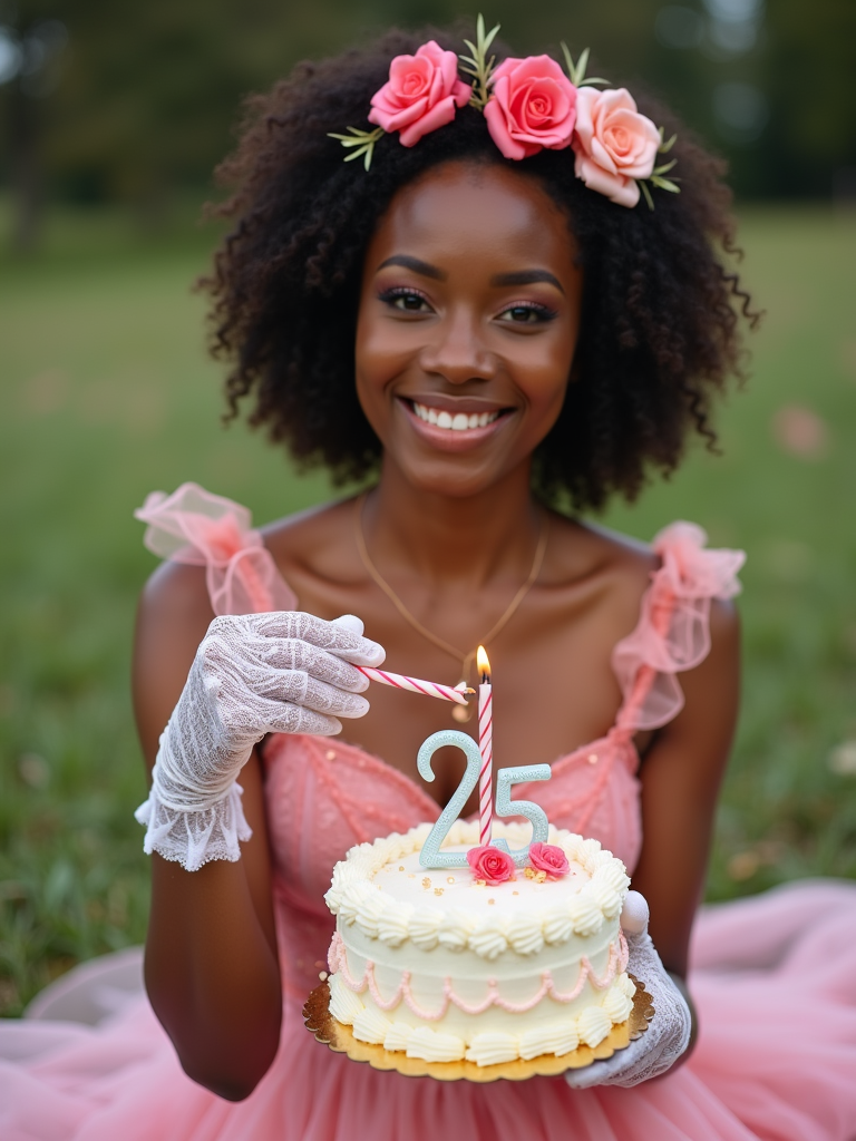 model posing with a birthday cake with candles, wearing a vintage-style pink birthday dress and lace gloves , festive picnic scene with ribbons and cake close-up