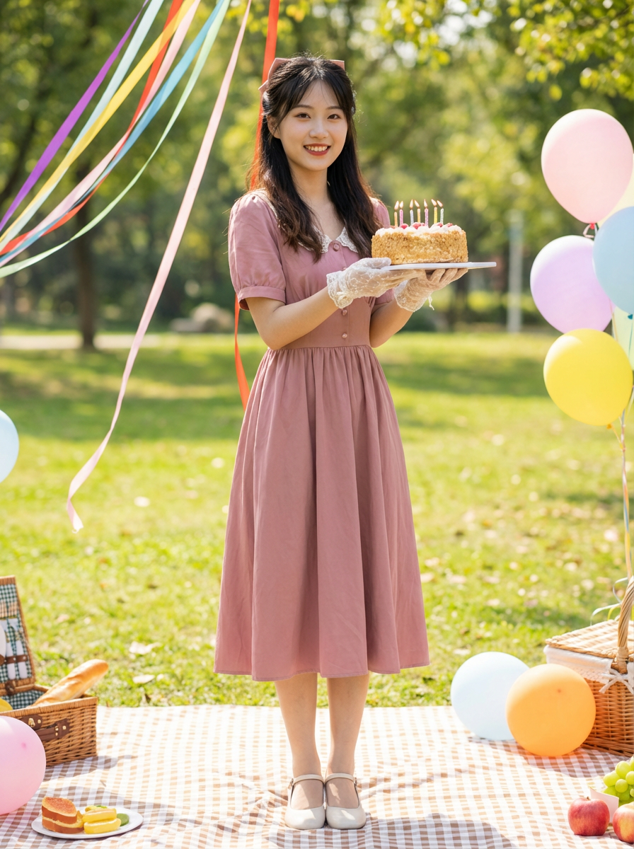 model posing with a birthday cake with candles, wearing a vintage-style pink birthday dress and lace gloves , festive picnic scene with ribbons and cake close-up