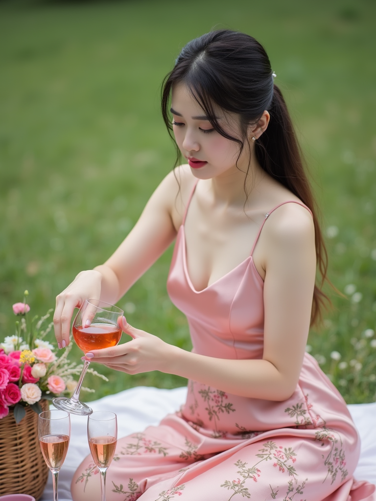 model pouring rosé or sparkling drink into a glass, wearing a satin pink camisole and floral skirt , with a decorated picnic setup, flowers and drinks visible