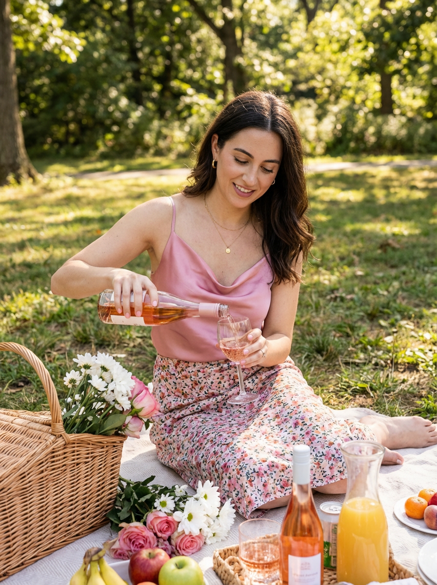 model pouring rosé or sparkling drink into a glass, wearing a satin pink camisole and floral skirt , with a decorated picnic setup, flowers and drinks visible