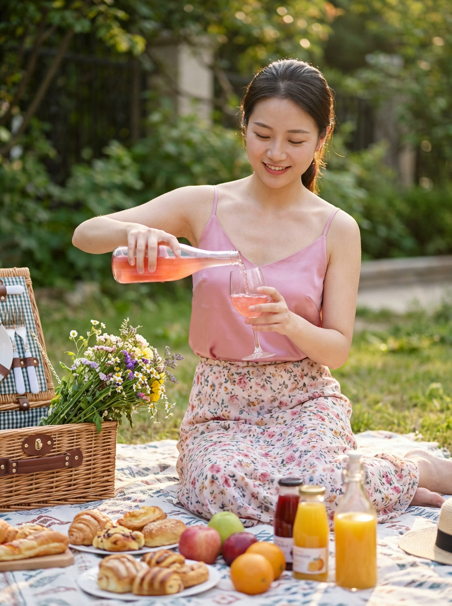 model pouring rosé or sparkling drink into a glass, wearing a satin pink camisole and floral skirt , with a decorated picnic setup, flowers and drinks visible
