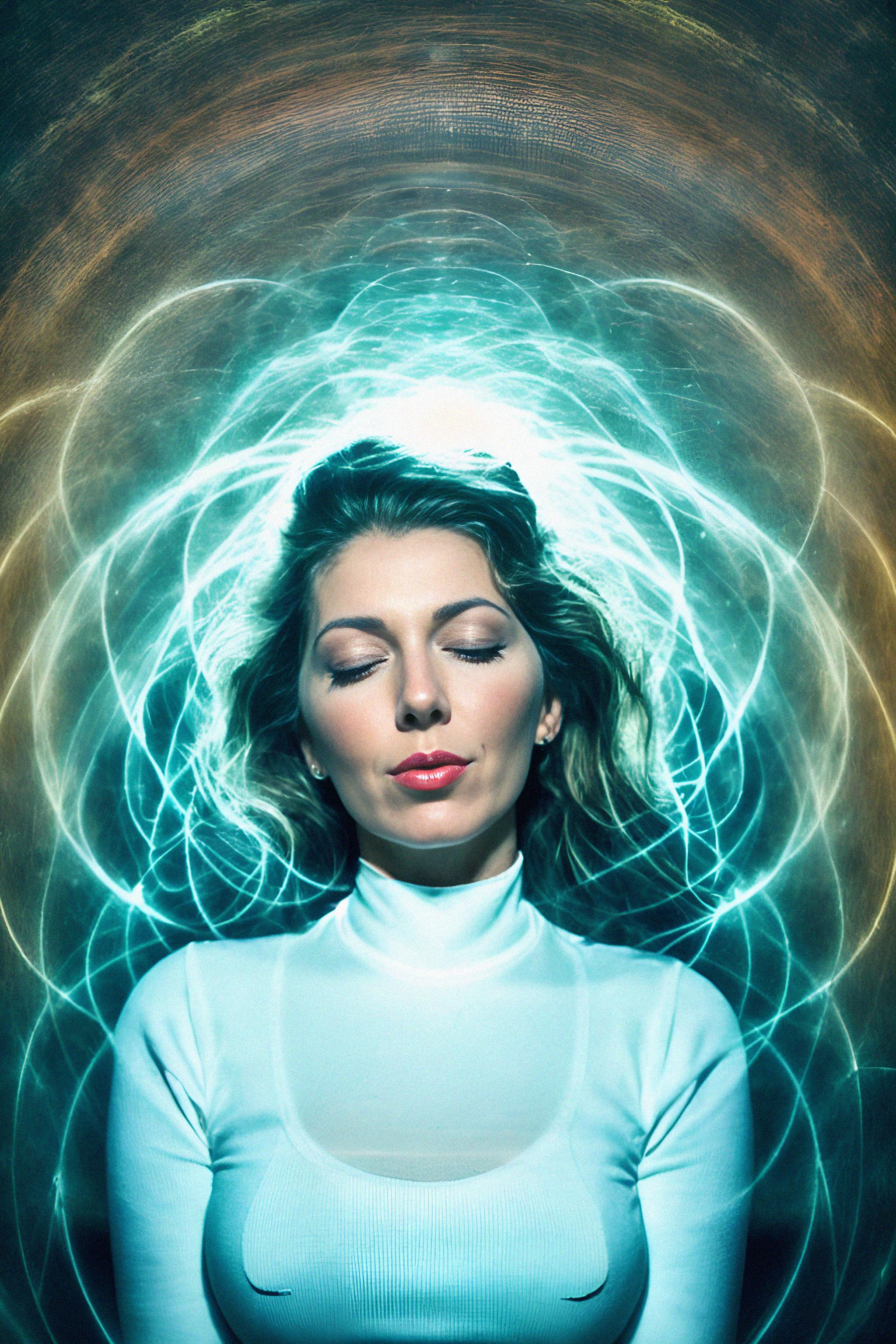 model practicing breathwork or pranayama, capturing the connection to the life force energy and the expansion of consciousness