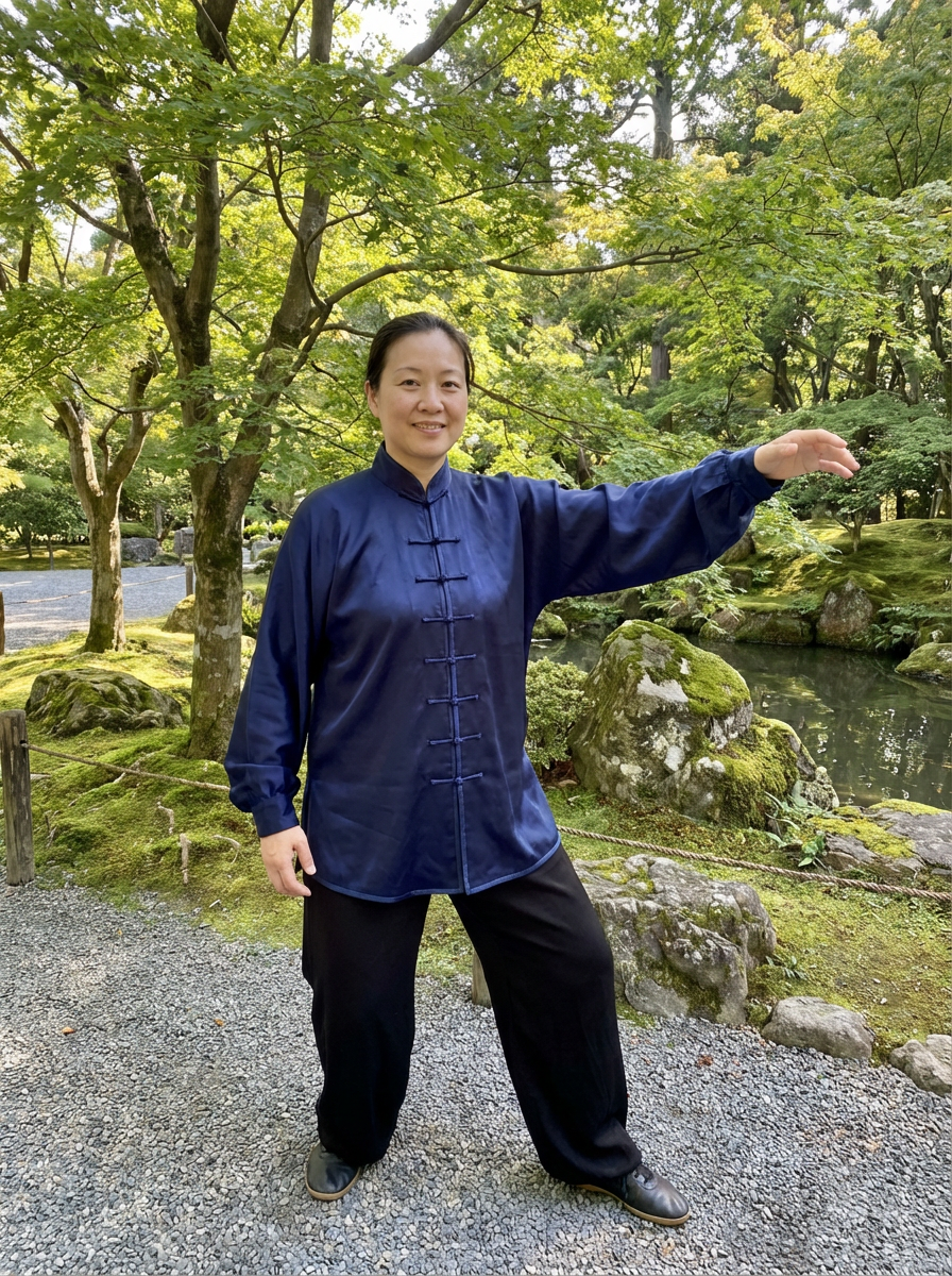model practicing Tai Chi in a serene garden